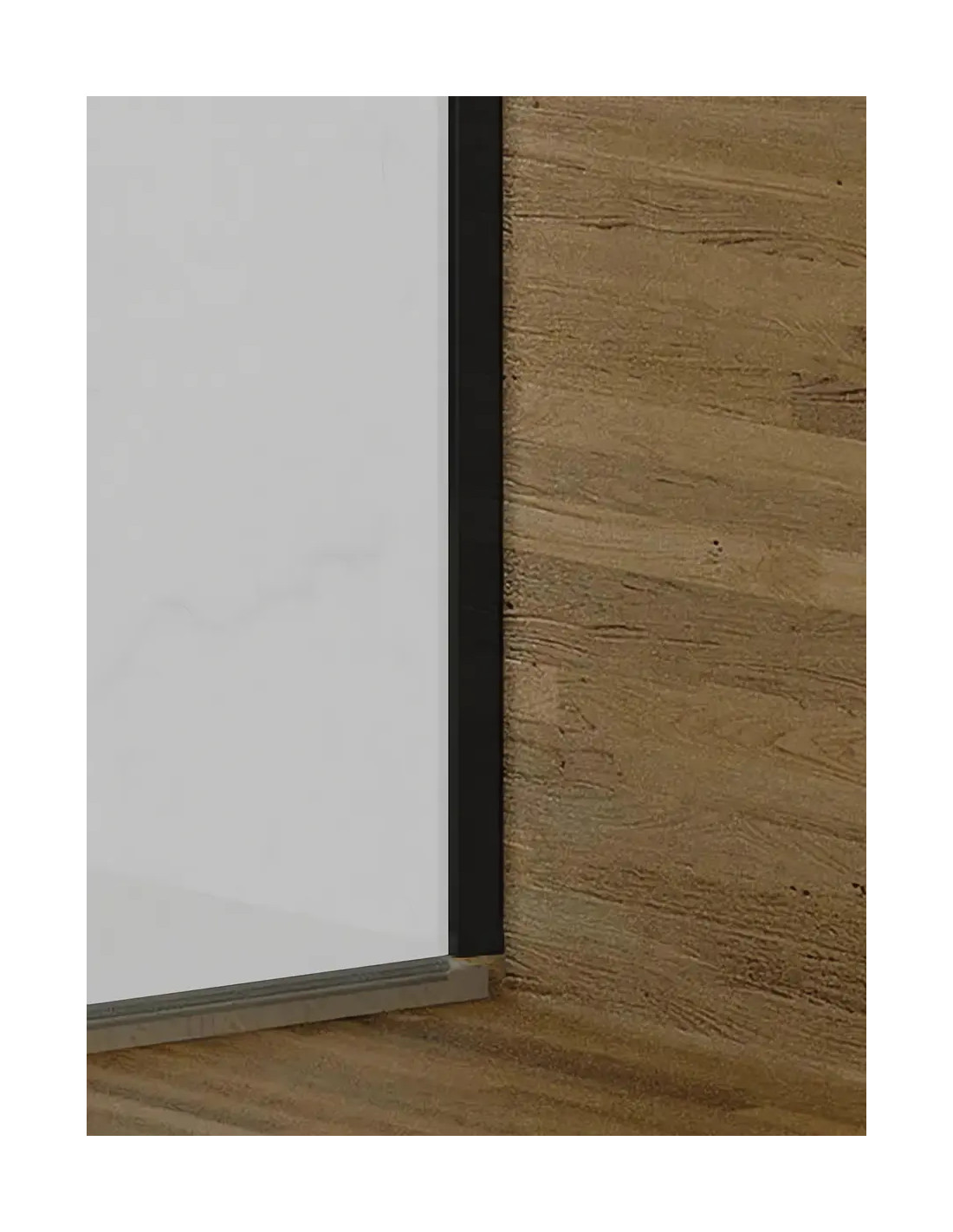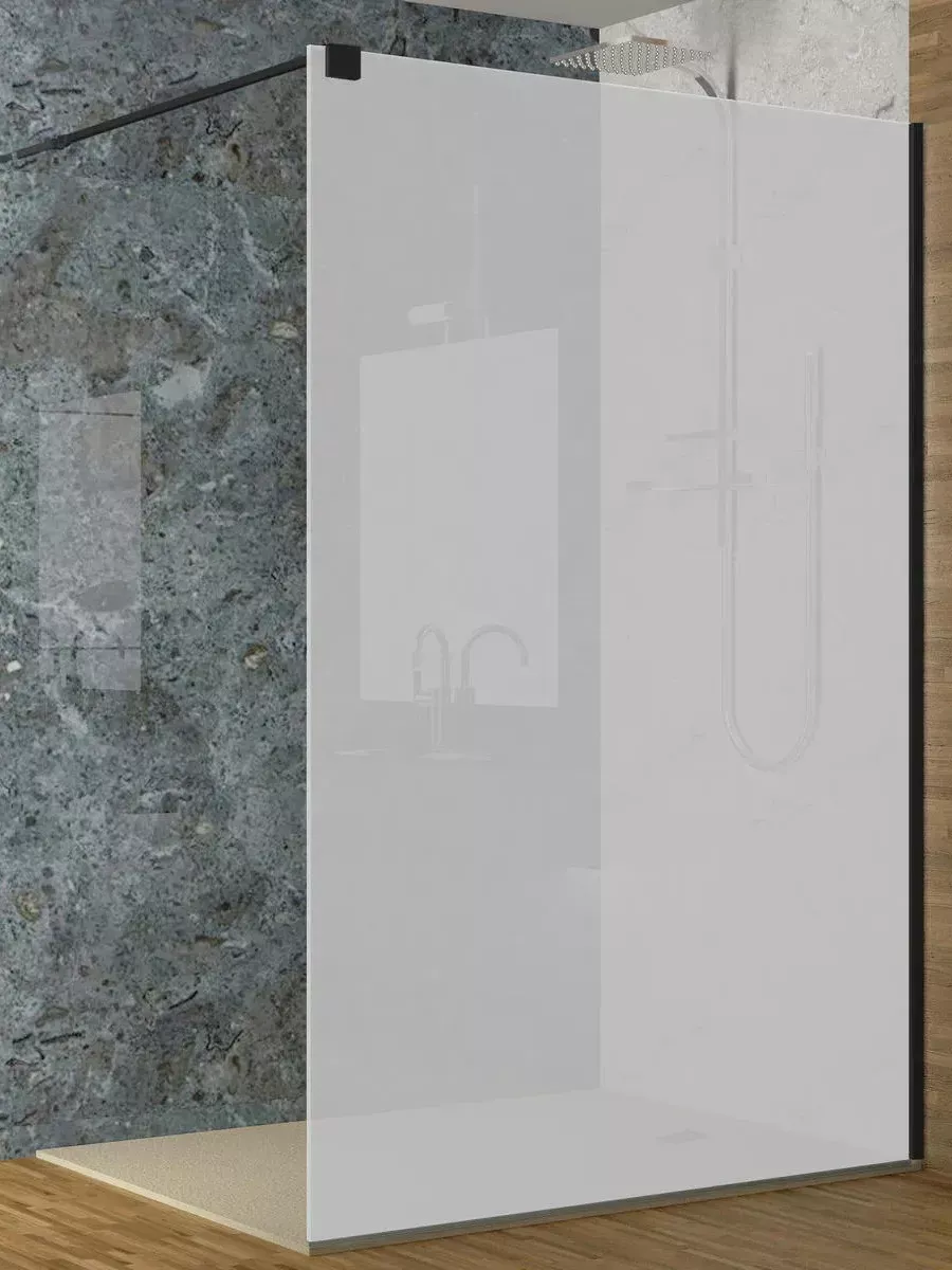 Mampara de ducha, cristal fijo transparente de 8 mm y una altura de 200 cm. Perfilería a la pared y barra de sujeción de aluminio anodizado pulido con terminación en plata brillo o negro. Barra de sujeción recortable de 90 cm de largo.