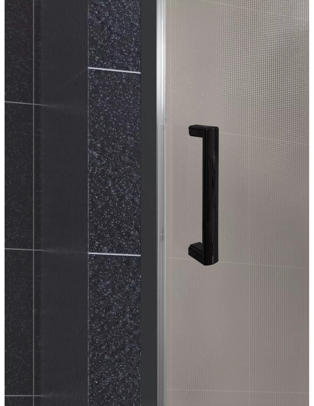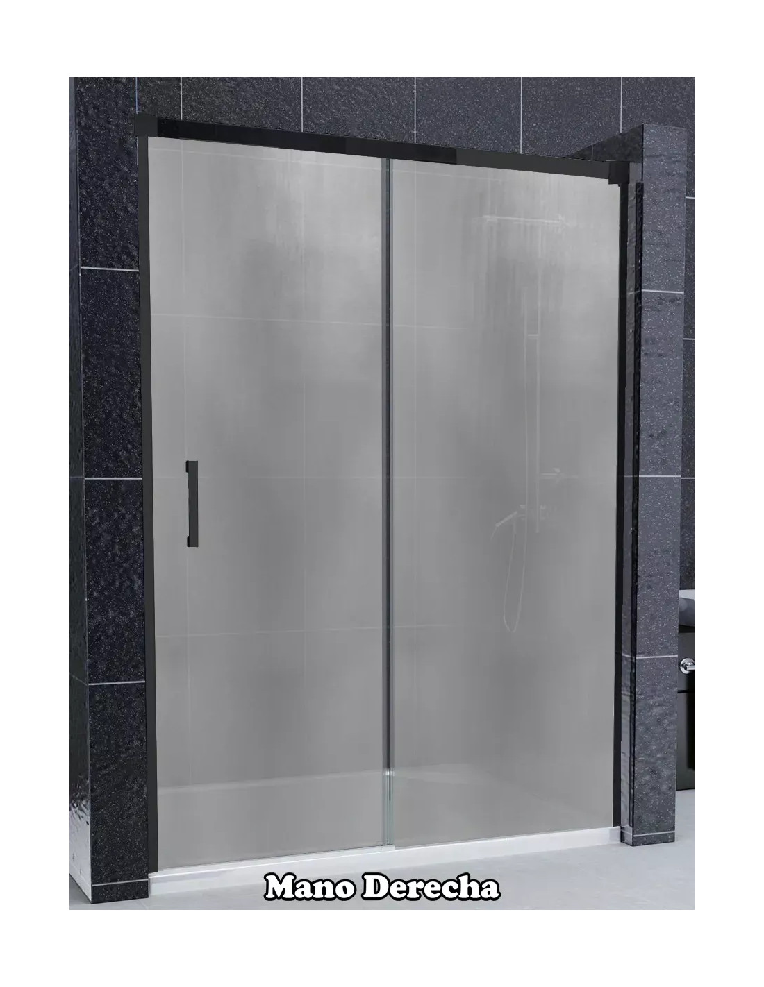 Mampara de ducha frontal formada por un fijo con puerta corredera, cristal de 6 mm, perfilería arriba y en los lados y una altura de 195 cm. Perfilería de aluminio anodizado pulido con terminación en negro mate. Perfilería lateral fina.