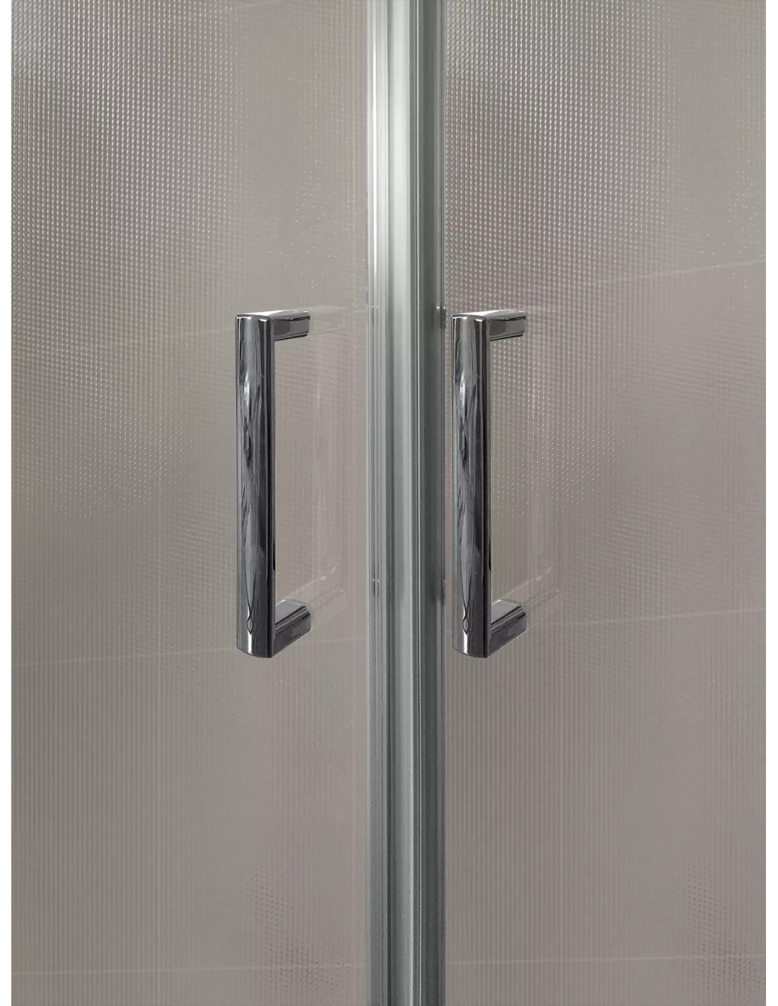 Mampara de ducha frontal formada por 2 fijos con 2 puertas correderas, cristal de 6 mm, perfilería lateral fina, sin perfilería inferior y una altura de 195 cm. Perfilería de aluminio anodizado pulido con terminación en plata brillo. Cristal New Glass.
