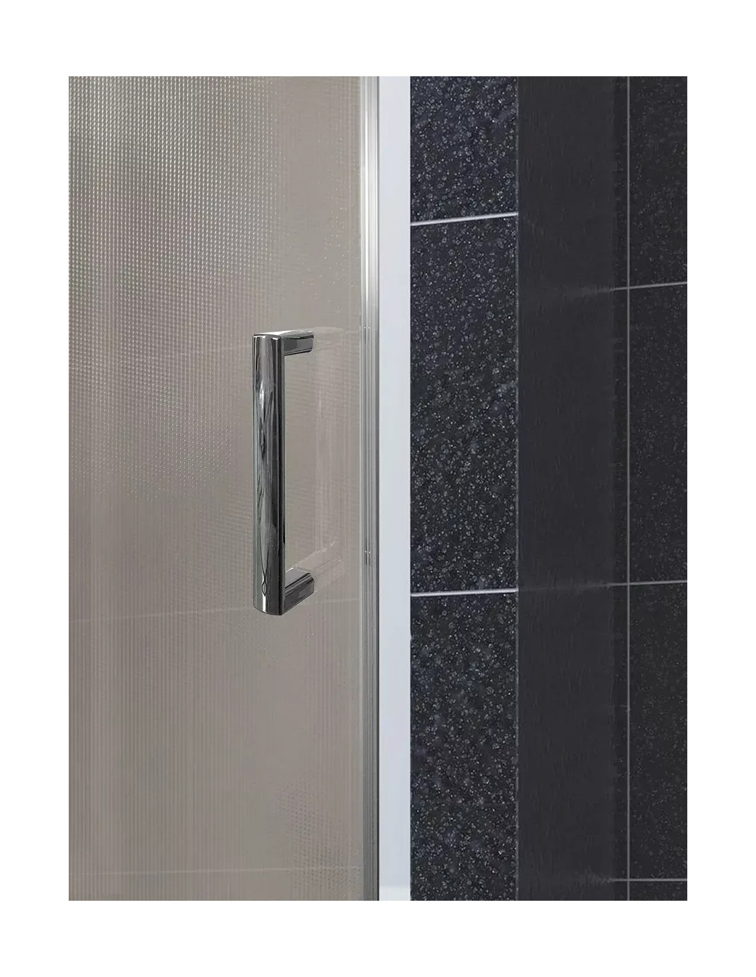 Mampara de ducha frontal formada por un fijo con puerta corredera, cristal de 6 mm, perfilería en toda su estructura y una altura de 195 cm. Perfilería de aluminio anodizado pulido con terminación en plata brillo.