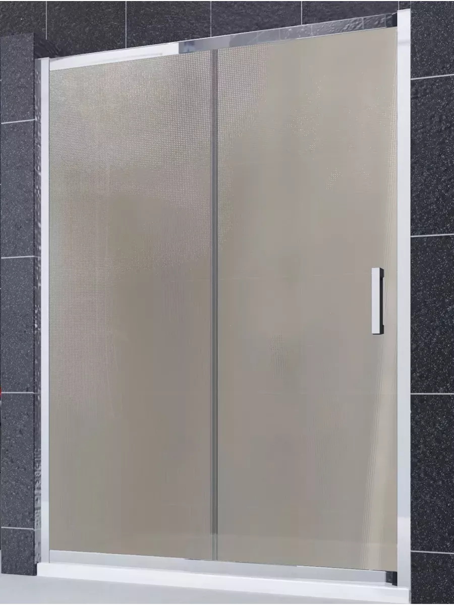 Mampara de ducha frontal formada por un fijo con puerta corredera, cristal de 6 mm, perfilería en toda su estructura, ancho de 150 cm y una altura de 190 cm. Perfilería de aluminio anodizado pulido con terminación en plata brillo.