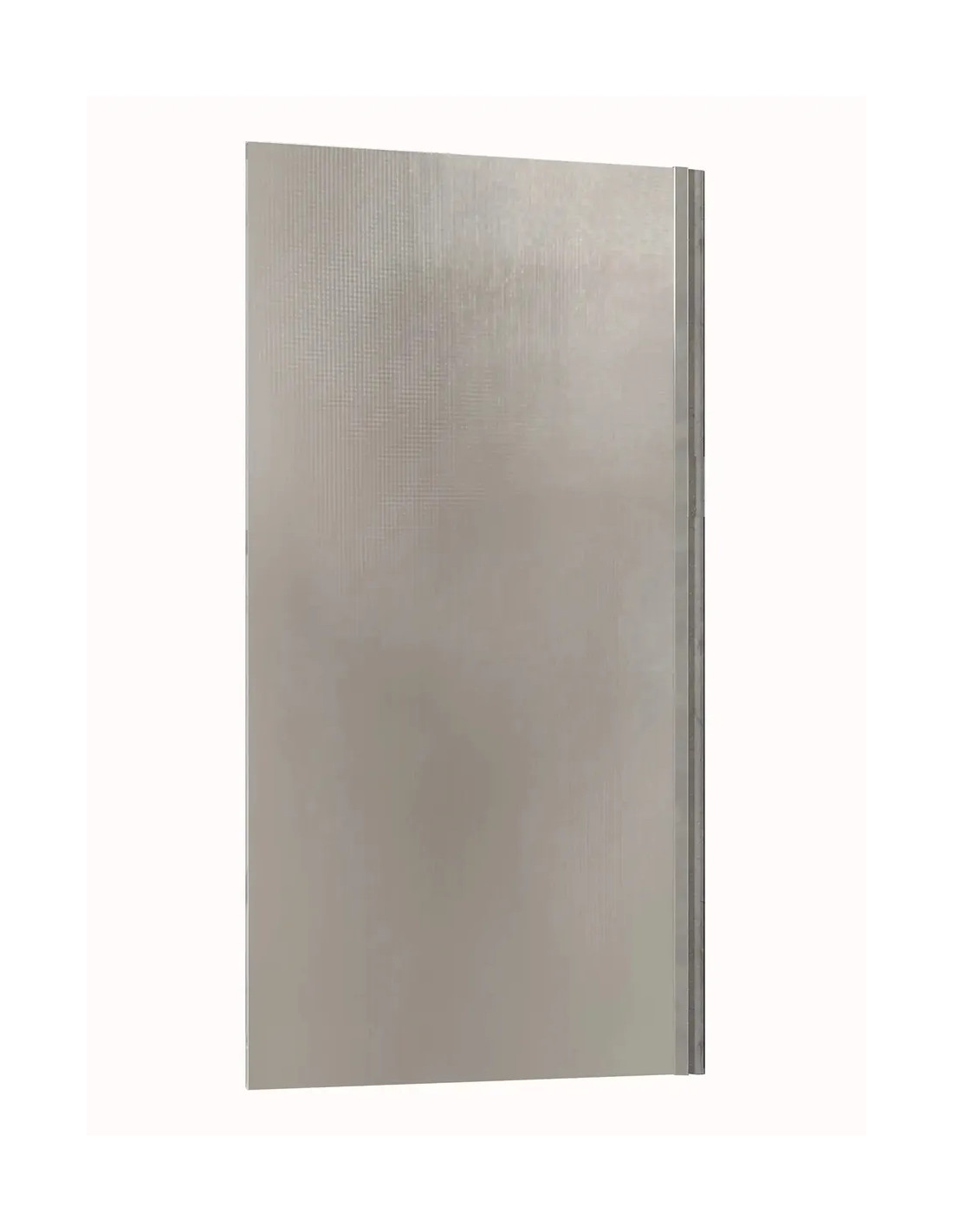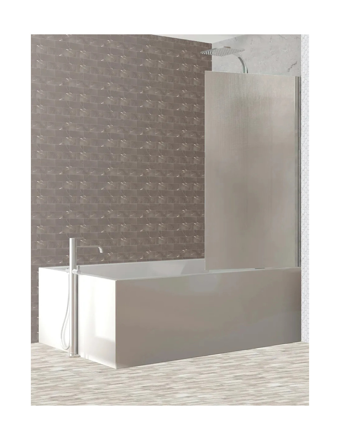 Mampara de bañera abatible, cristal de 6mm, perfilería a la pared, anchura de 85 cm y una altura de 150 cm.  Perfilería de aluminio anodizado pulido con terminación en plata brillo. Cristal decorado lineal o mate New Glass.
