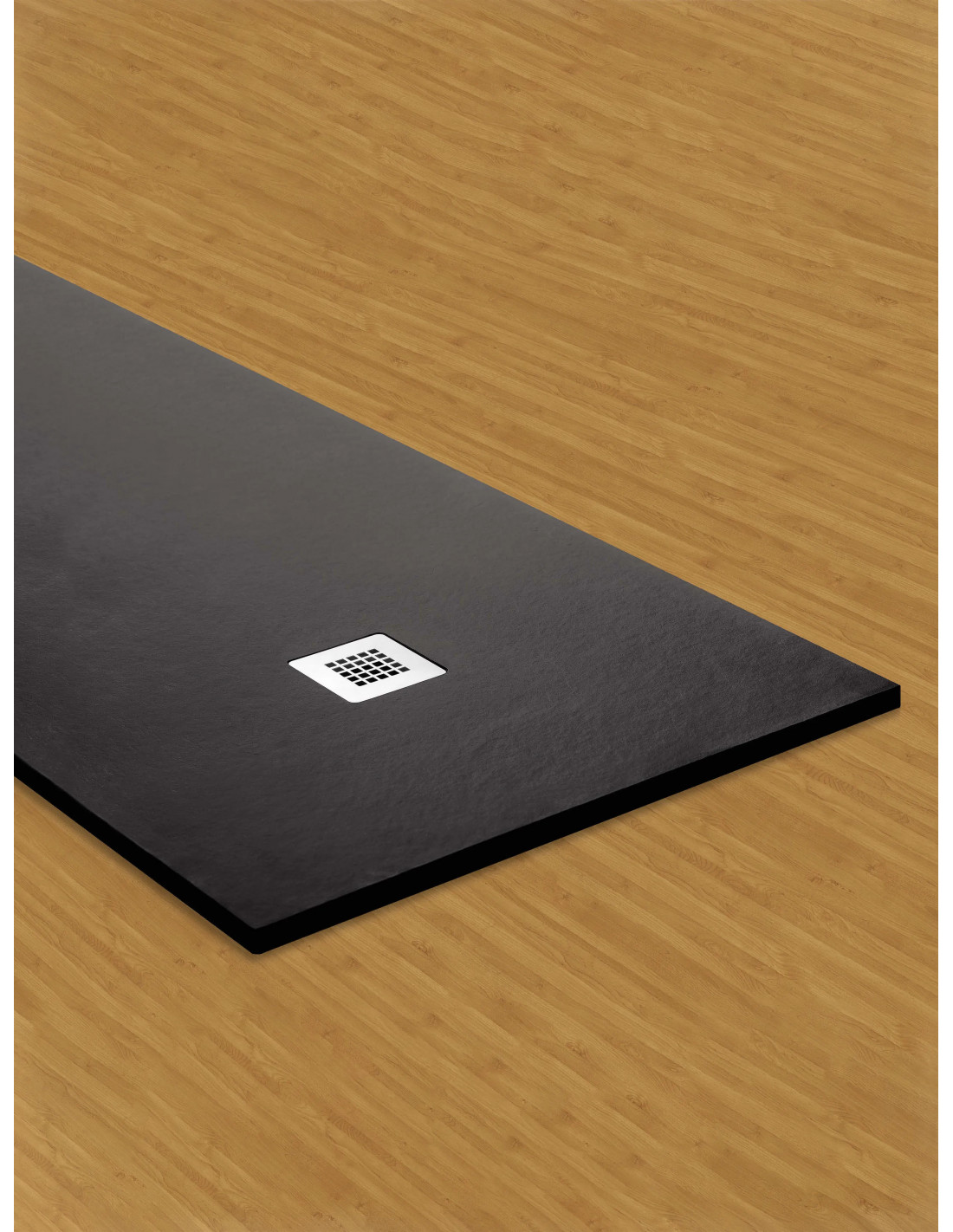 Plato de ducha fabricado en resina y cargas minerales, con textura pizarra y acabado en colores blanco, crema o grafito. Válvula incluida.