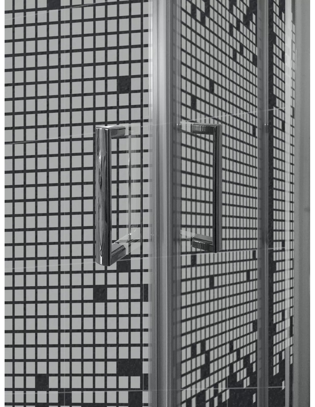 Mampara de ducha formada por dos fijos con dos puertas correderas en vértice con cristal de 6 mm decorado cuadros, sin perfilería en su parte inferior, altura de 195 cm. Perfilería de aluminio anodizado pulido con terminación en plata brillo.