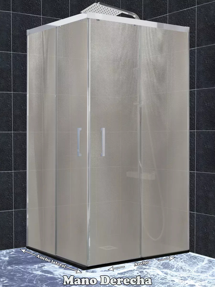 Mampara de ducha formada por dos fijos con dos puertas correderas en vértice con cristal de 6 mm, con perfilería lateral fina acabada, sin perfilería en su parte inferior, altura de 195 cm. Perfilería de aluminio anodizado pulido con terminación en plata brillo. Cristal New Glass.