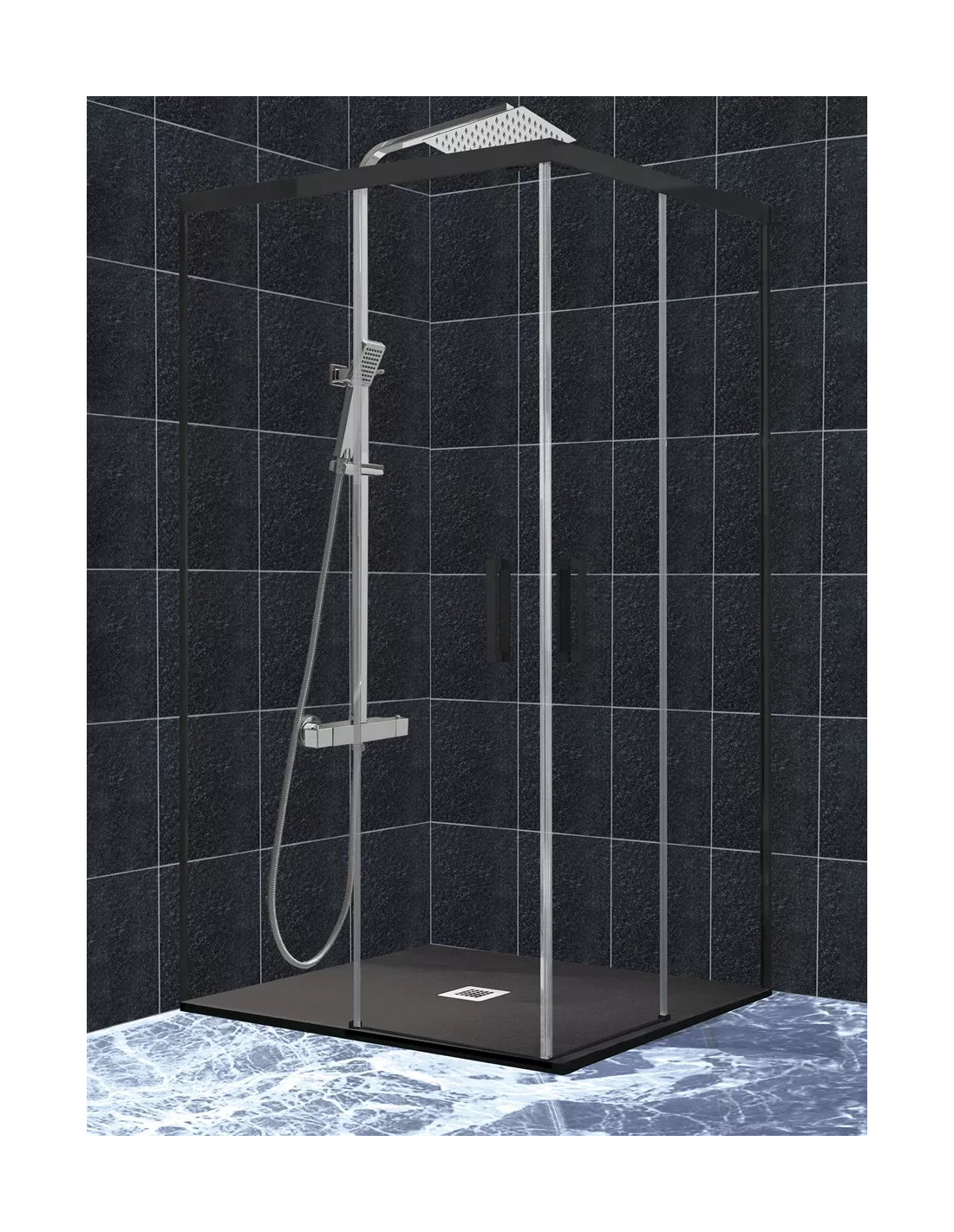 Mampara de ducha 2 fijos con 2 puertas correderas en vértice perfil negro mate - modelo Contract