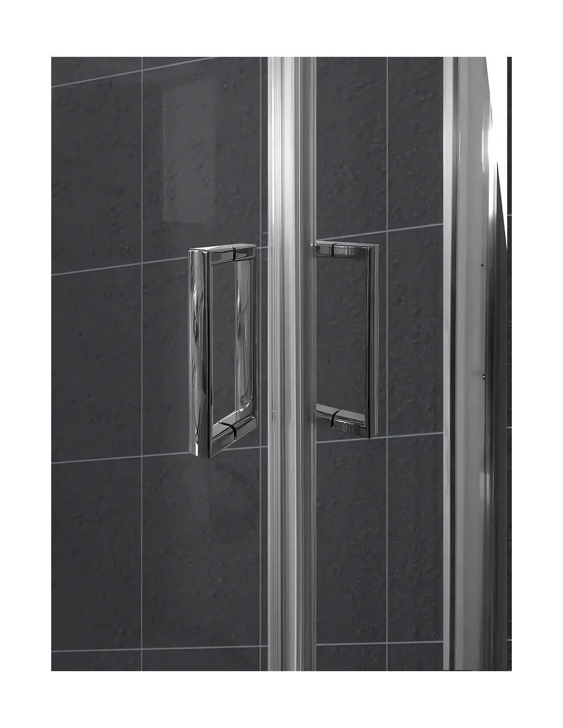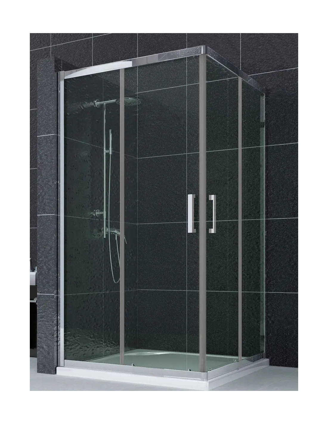 Mampara de ducha formada por dos fijos y dos puertas correderas en vértice, con cristal de 6 mm, perfilería en toda su estructura y una altura de 195 cm. Perfilería de aluminio anodizado pulido con terminación en plata brillo.