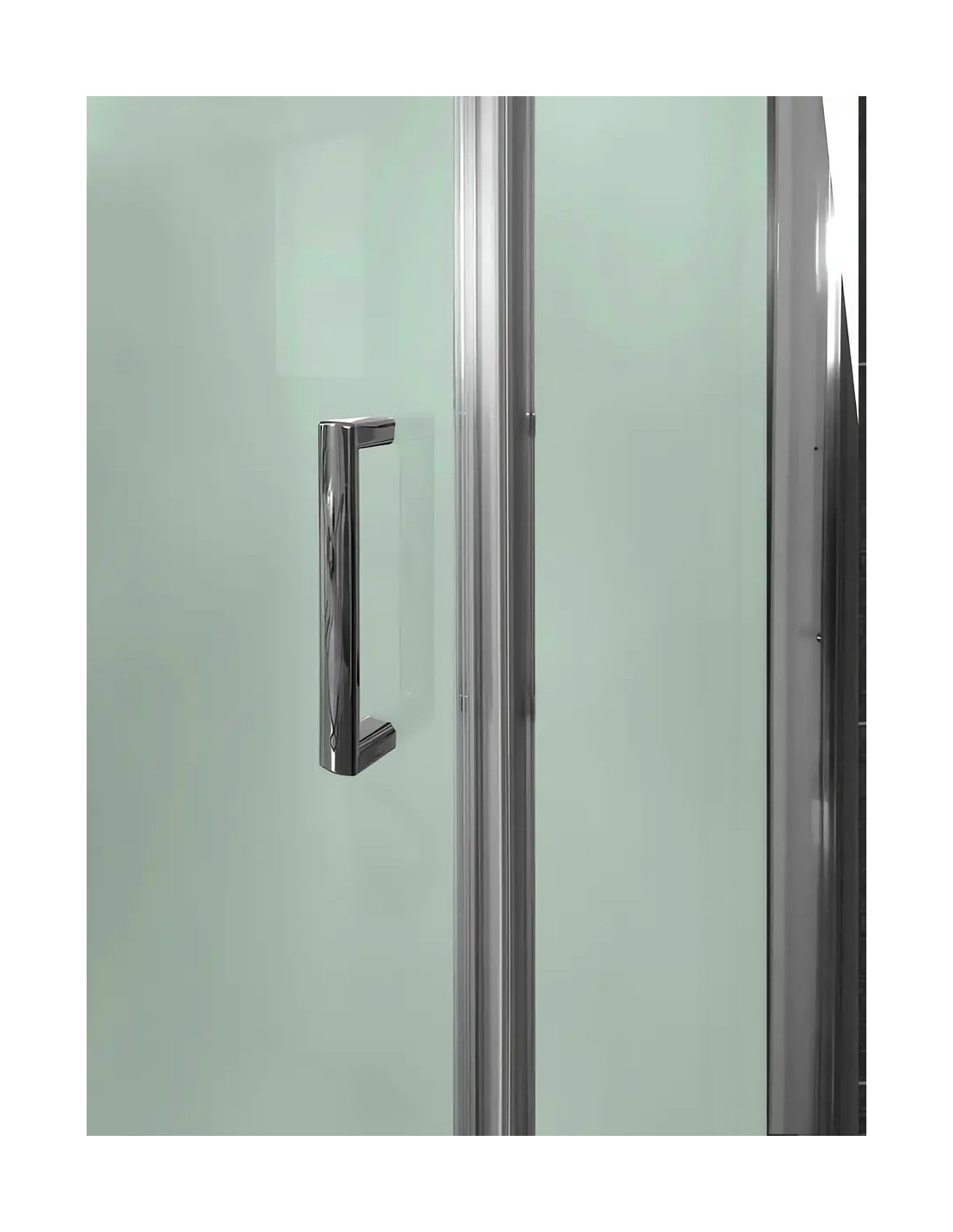 Mampara de ducha formada por un fijo frontal, una puerta corredera y un lateral fijo, con cristal de 6 mm, perfilería en toda su estructura y una altura de 195 cm. Perfilería de aluminio anodizado pulido con terminación en plata brillo.